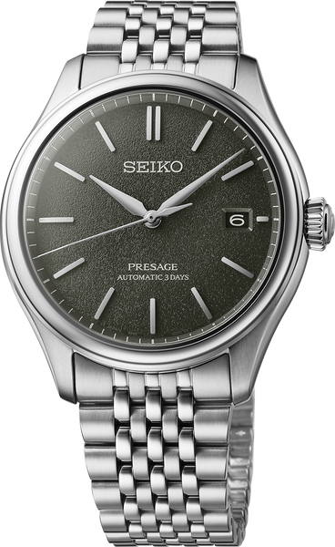 Presage Classic Series. Offering the finest in Japanese mechanical watchmaking, the Presage Collection blends precision technology with superior craftsmanship and design. The Presage Classic Series draws from the colors, materials and textures of traditional crafts, each timepiece gracefully expressing Japan’s timeless beauty. In “sensaicha”, a dark brownish-green color that was fashionable during the Edo Period, the curved dial of this streamlined design has a richly textured pattern that evokes the lustrous fabric, while capturing and reflecting ambient light to create a heightened sense of depth and beauty. Visible through the screwdown, see-through caseback, Seiko’s 6R caliber, 24-jewel automatic movement beats at a frequency of 21,600 vibrations per hour, with an exceptional power reserve of 72 hours, manual winding capability and a date calendar complication. Crafted of stainless steel, the case is constructed with smooth curved surfaces and includes a dual curved sapphire crystal, echoing the contours of the dome-shaped dial. The retro-inspired multi-row bracelet with curved top surfaces helps achieve a superbly sleek and comfortable fit and is equipped with a deployment clasp with push button release. 10 bar, 100M Water Resistant.