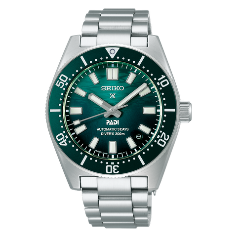 Prospex 1965 Heritage Diver’s PADI Special Edition. Seiko Prospex challenges every limit with timepieces created to exceed expectations, engineered with superior style and innovative technology for the sea, sky or land. Driven by a rich legacy that has set the standard for dive watch specifications and a heritage of iconic design, Prospex continues to keep going forward with precision timekeeping, crafted for the modern world. This exciting Special Edition celebrates Seiko’s first diver’s watch and the ongoing partnership with PADI, beautifully displaying a vibrant green patterned dial, reflecting the underwater view of waves on the ocean surface illuminated by sunlight. Framed by a coordinating uni-directional rotating elapsed timing bezel, the eye-catching dial offers a date calendar between 4 and 5 o’clock allowing for LumiBrite coating on the hands and all 12 markers, improving symmetry and legibility. With an impressive power reserve of approximately 72 hours, 3 full days, the 24-jewel automatic movement beats at a frequency of 21,600 vibrations per hour with manual winding capability. Crafted of stainless steel with super-hard coating, this superbly functional timepiece includes a curved sapphire crystal with anti-reflective coating on the inner surface, as well as a screwdown crown and caseback. Following ISO standards for scuba diving to depths of up to 300 meters, the innovative creation preserves a streamlined case profile while incorporating a sleek bracelet equipped with a specially developed slide adjuster clasp with a double lock, allowing for easy size adjustment. Highlighting Seiko’s conservation efforts in collaboration with PADI, the Special Edition is presented with additional green fabric diver’s strap made from 100% recycled plastic bottles, braided with the traditional Japanese Seichu technique for exceptional strength. 300m Water Resistant