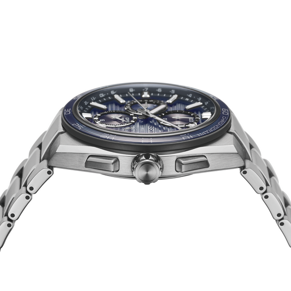 Astron GPS Solar Dual-Time Chronograph. Extending the legacy of the Seiko Astron, the world’s first commercially available quartz watch, today’s Astron is designed for a new generation of leaders to break through to a new future with excellence in both innovation and style. Combining solid tailoring with the highest degree of accuracy possible in a wristwatch, this exceptional timepiece is equipped with Seiko’s 5X83 caliber, offering both high-speed GPS dual time and time zone adjustment to 39 time zones and a chronograph function that measures elapsed time in 1/20th second increments. The precision watch features an AM/PM indicator, daylight saving time function, power save function, perpetual day/date calendar correct to the year 2100, and a time transfer function that allows the user to switch the main time and dual time indications with the push of a button, all powered by light energy with no battery change required. Framed by a titanium bezel with a brilliant blue sapphire insert and topped with dual curved sapphire crystal with super-clear coating, the blue-gray patterned dial displays a distinct texture, made possible by improved charging efficiency of the solar cell, providing an outstanding contrast to the subdials. In addition to the four subdials, laid out vertically for a sporty look, the dial includes a date calendar and LumiBrite hands and markers for enhanced visibility in low-light conditions. Crafted of light and durable titanium with super-hard coating, this superb timepiece has a contemporary feel thanks to the sleek lines, slim profile, and the compact and angular design that seamlessly flows from the case to the bracelet and includes a secure screwdown caseback and tri-fold push button release clasp with Smart Adjuster function. 10 bar, 100M Water Resistant