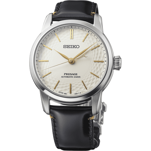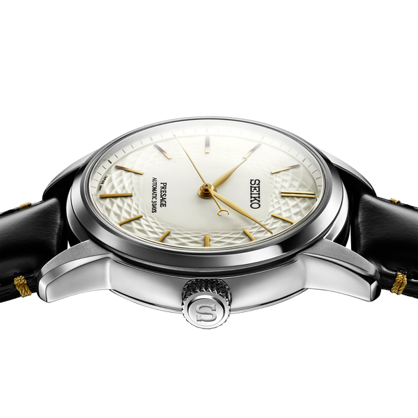 Presage Classic Series Arita Porcelain “Unglazed” Limited Edition. Offering the finest in Japanese mechanical watchmaking, the Presage Collection blends precision technology with superior craftsmanship and design. Arita Porcelain is among the classic expressions of Japanese artistry, used to create high-strength, three-dimensional dials, individually crafted by master artisans in a multi-step process combining technical innovation with centuries of inspiration. This extraordinary Limited Edition, available only in a controlled-production run of 1,200 with the serial number engraved on each screwdown see-through caseback, displays a warm white Arita Porcelain dial in its natural unglazed form, highlighting the curves and ridges of an impressive diamond-shaped pattern, enhanced by slim and contemporary gold-tone accents. With a power reserve of 72 hours, the 24-jewel automatic movement beats at a frequency of 21,600 vibrations per hour and offers manual winding capability. Crafted of stainless steel and topped with a dual curved sapphire crystal, this artfully crafted masterpiece is complemented by a glossy black leather strap, sourced from an LWG-certified tannery. 10 bar, 100M Water Resistant