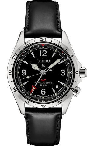 24-hour GMT bezelRed-tipped GMT handRotating inner compass bezelLumiBrite hands and markersProspex Alpinist Mechanical GMTTri-fold push button release claspScrewdown crown and see-through casebackAutomatic GMT with manual winding capabilityInspired by Seiko’s first sports watch, the 1959 AlpinistBlack dial with iconic wedge-shaped markers and stylized numerals and hands