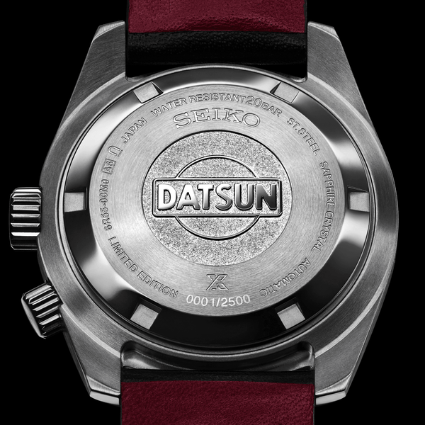 Prospex Speedtimer Mechanical DATSUN 240Z Limited Edition. Seiko Prospex challenges every limit with timepieces created to exceed expectations, engineered with superior style and innovative technology for the sea, sky or land. Driven by a heritage of iconic design, Prospex continues to keep going forward with excellence in precision timekeeping, crafted for the modern world. Commemorating the Seiko-supported “Datsun 240Z” Safari car that won the 6,200km East African Safari Rally in 1971, widely regarded as one of the toughest races in the world, this highly collectible Limited Edition is available only in a controlled production run of 2,500 pieces, with the serial number and the Datsun logo showcased on the screwdown caseback. Framed by a countdown timer dial ring that can be utilized to measure the remaining time of a particular event, the black dial features a font and color motif modeled after the original safari car instruments and prominently displays the Datsun logo as well as the word “Speedtimer,” honoring Seiko’s legacy of sports timing. The sporty dial is accented by a red second hand and includes a date calendar and LumiBrite hands and markers for superior visibility in low-light conditions, all topped with a curved sapphire crystal. With an upgraded power reserve of approximately 72 hours, 3 full days, the 24-jewel automatic movement beats at a frequency of 21,600 vibrations per hour with manual winding capability. Crafted of stainless steel with super-hard coating, this rugged yet refined watch has a 200 meter water resistance while boasting the slimmest case of any Seiko 6R model. Designed to flow seamlessly from the case to a special punch-pattern strap, sourced from an LWG certified tannery, it is equipped with a secure screwdown crown and tri-fold push button release clasp.