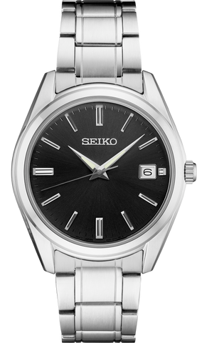 From the Essentials Collection. With classic dress/sport styling, this perfectly tailored design combines sophisticated minimalism with versatility. The rich black dial features a date calendar and LumiBrite hands. In stainless steel, with sapphire crystal for superior scratch resistance. 10 bar, 100M Water Resistant