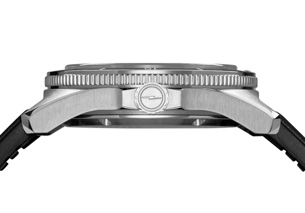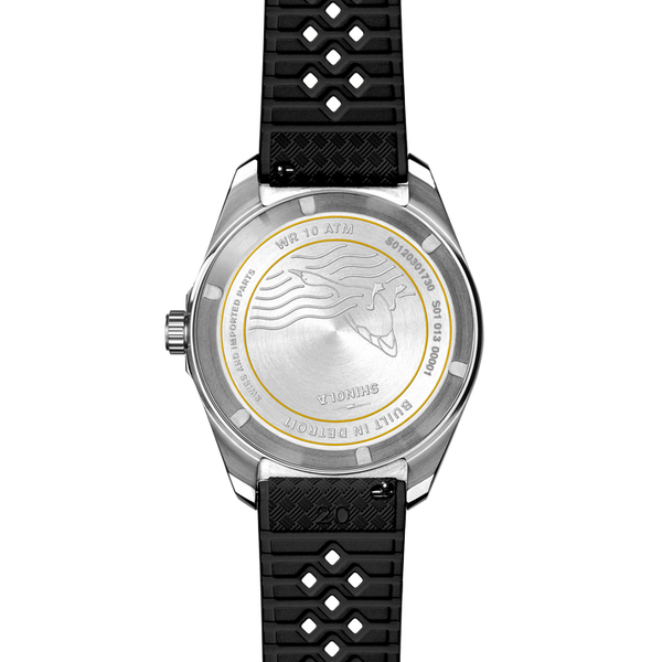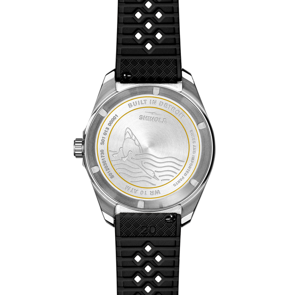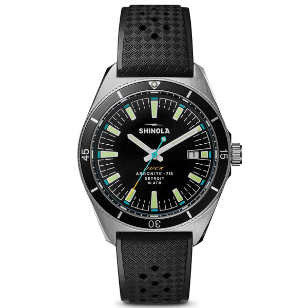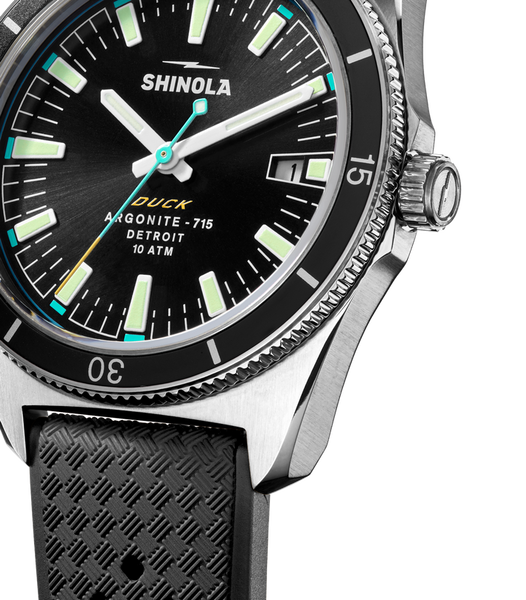 Introducing the Duck 1040. we've reimagined our bestselling adventure-proof, water-resistant sport watch with an all-new design. Inspired by skin-diving gear and of course, the feathered fowl who do it best. The Duck 1040 features stainless-steel case with screw-down crown, unidirectional bezel, sapphire crystal, 3 Super Lumi-Nova on the dial and hands, and new reimagined tropic style rubber strap with basket weave texture. Flip the watch to reveal the custom caseback featuring relief etching of the Ducks namesake in action. This sporting timepiece looks as good out of the water as it does in it and Its built for all of life's adventures.