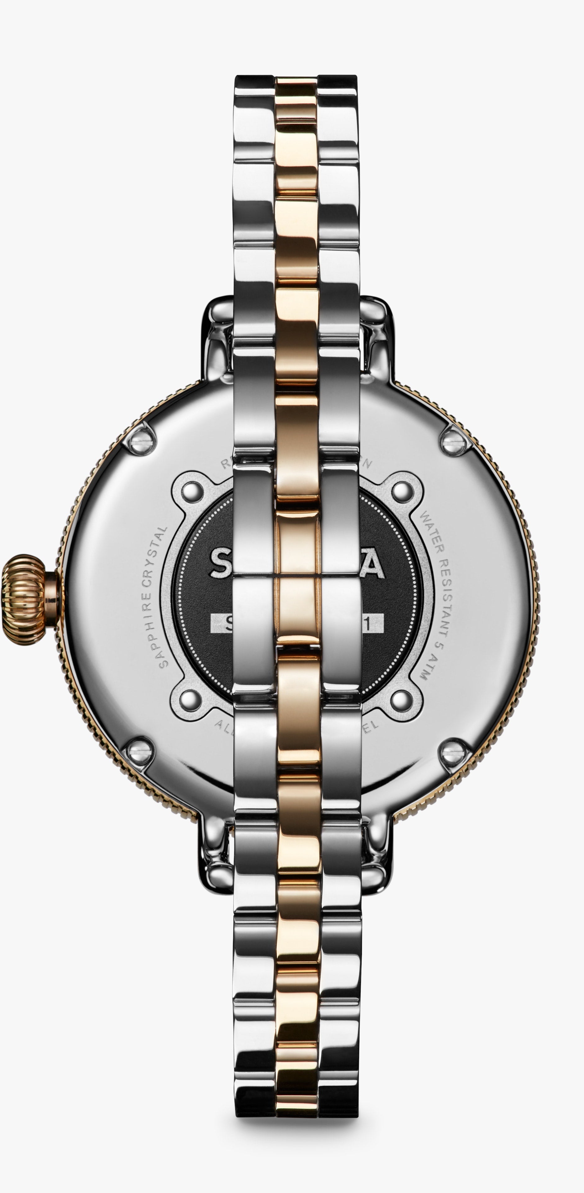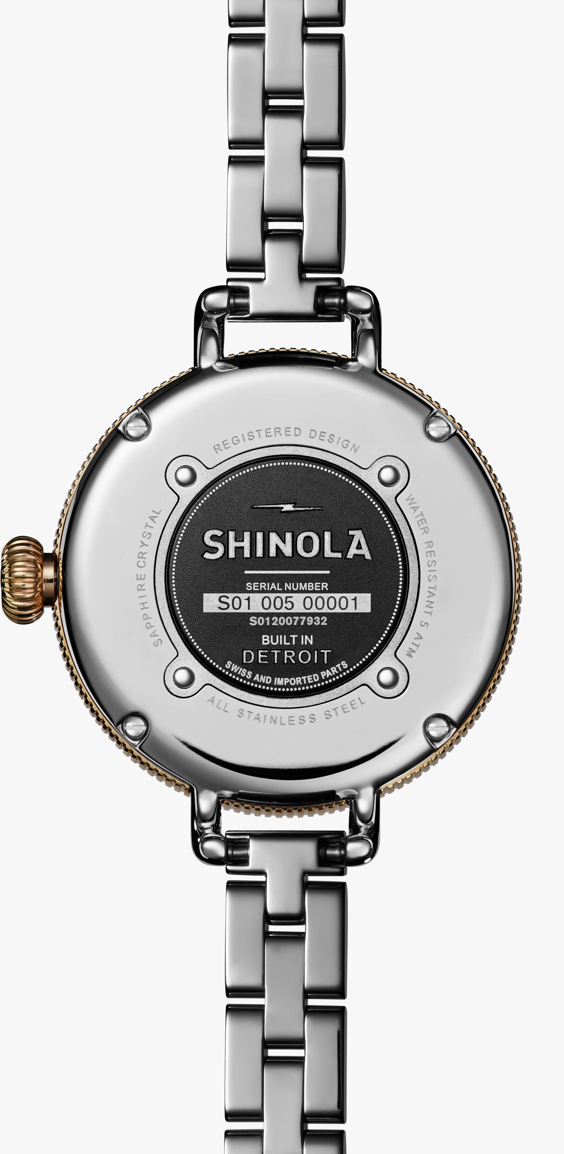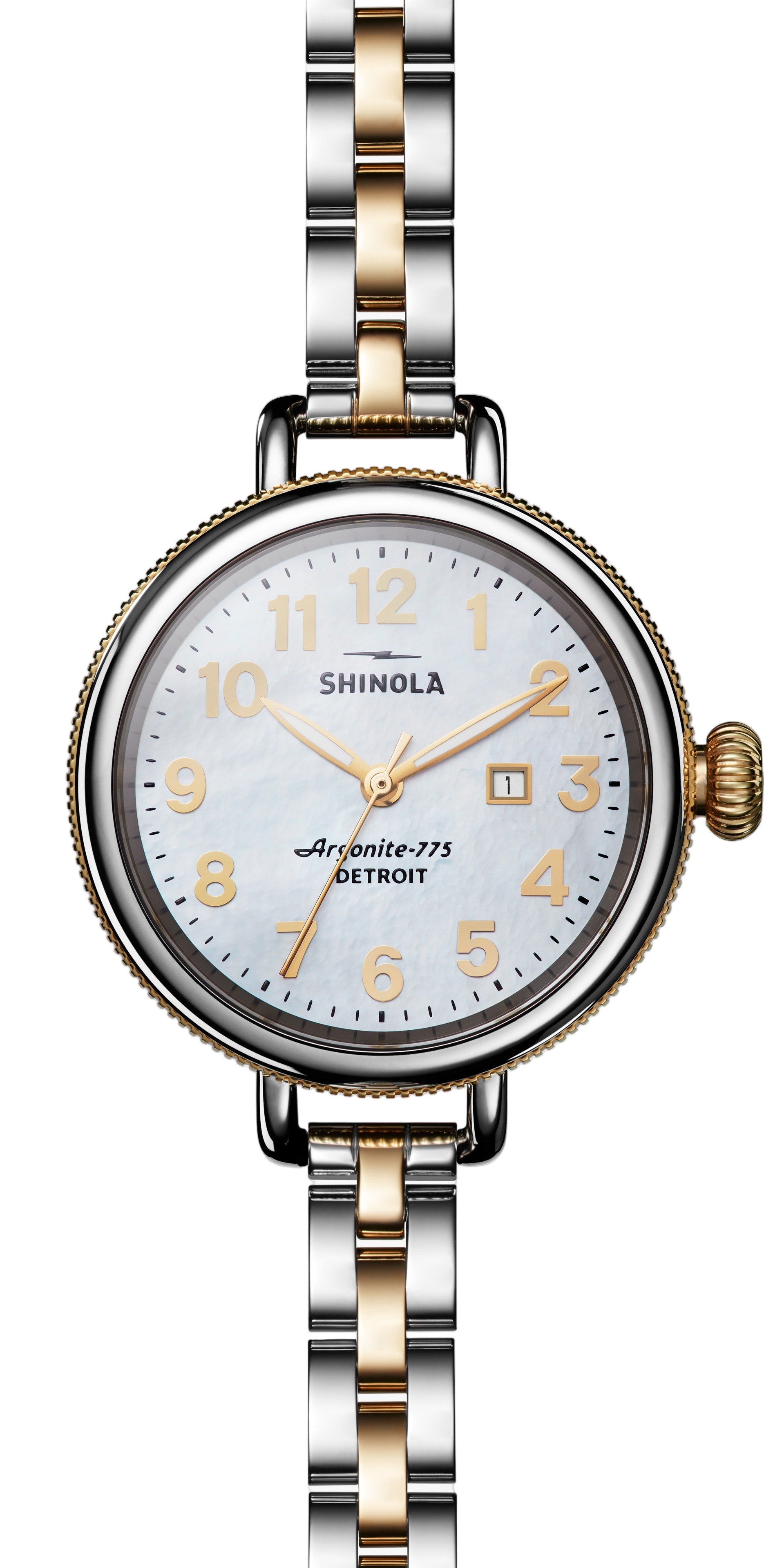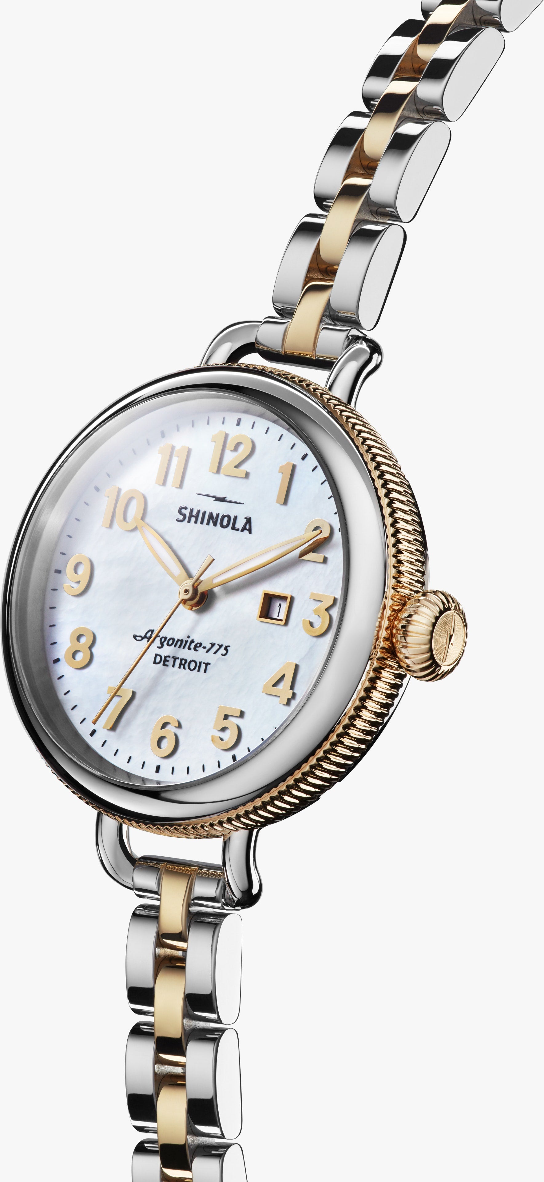 THIN AND THOUGHTFUL This playful, yet powerful evolution of a classic features all the signature Shinola details—a bold dial in white mother of pearl, coin edge and wire lugs — but keeps life interesting with a modern, stainless steel and PVD Gold bracelet. It's a tale of epic proportions, alternative dimensions and meticulous craftsmanship.
