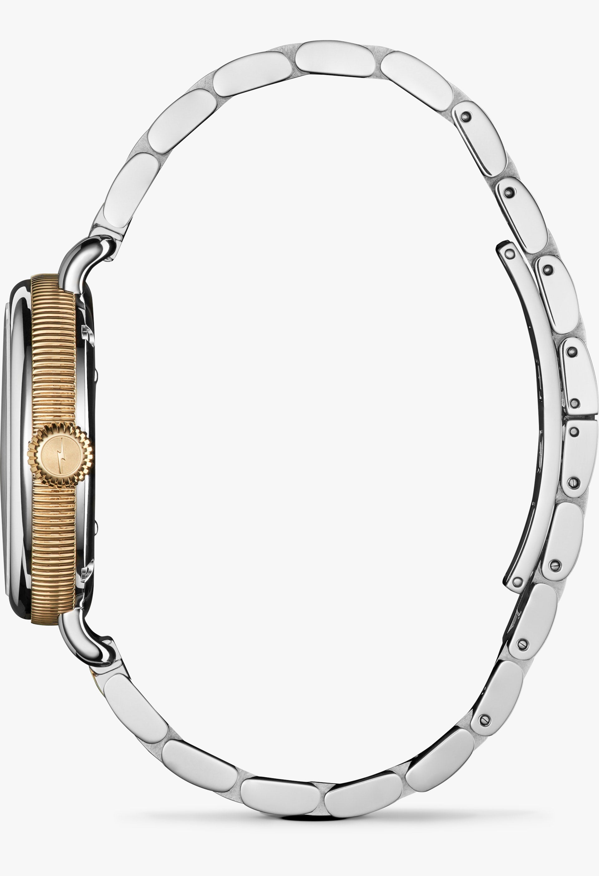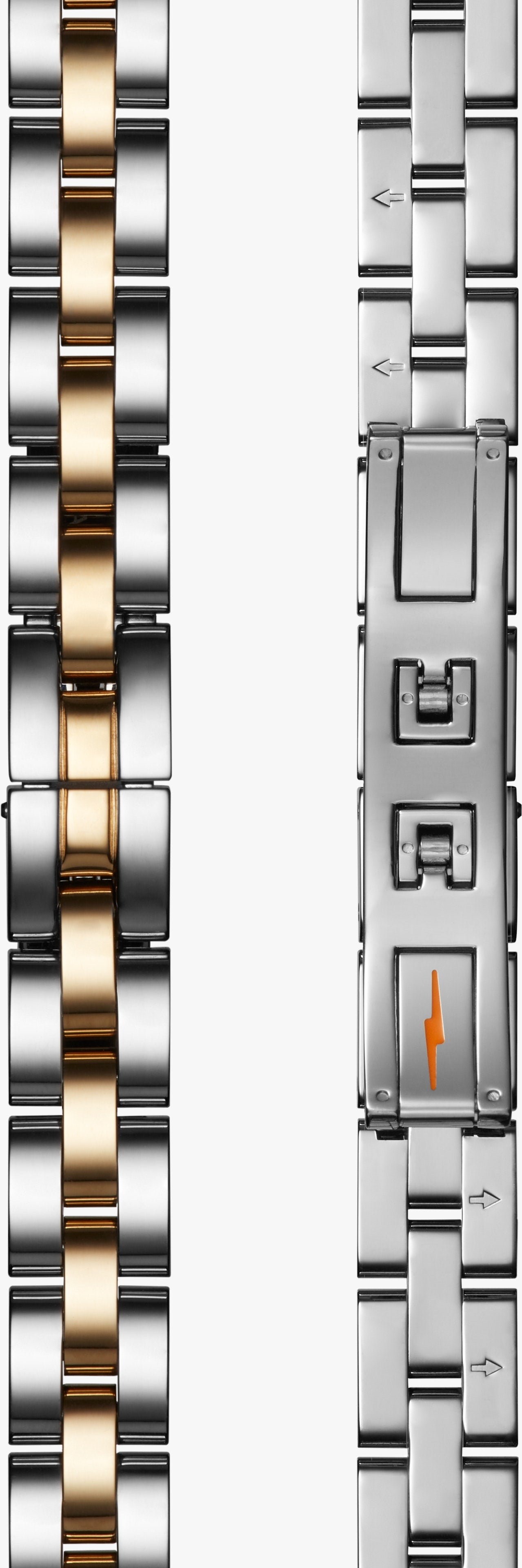 • Polished Stainless Steel And Pvd Gold Bracelet Crafted From Polished Stainless Steel And Gold Pvd, This Three-Link Bracelet Adds Refinement To This 34Mm Birdy. Designed To Seamlessly Match The Watch'S Casing, The Bracelet Features A Center Gold Link And Discrete, Hidden Clasp.