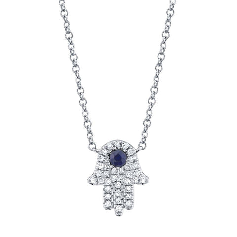 This enchanting Blue Sapphire and 1/10ctw Diamond 14k White Gold Hamsa Necklace radiates elegance and spiritual grace. The iconic Hamsa hand, symbolizing protection and good fortune, is adorned with a captivating deep blue sapphire at its heart—its celestial hue beautifully framed by a halo of shimmering round-cut diamonds. Each diamond sparkles against the cool, luminous sheen of 14k white gold, enhancing the necklace’s refined allure. A timeless piece of both beauty and meaning, it brings a touch of sophistication and serenity to any ensemble.