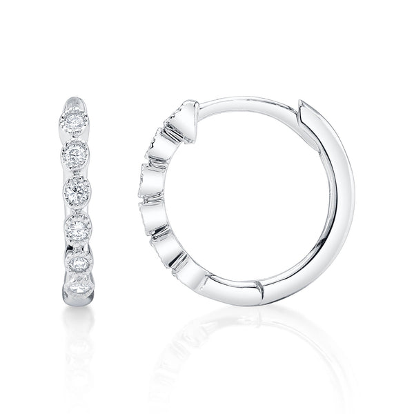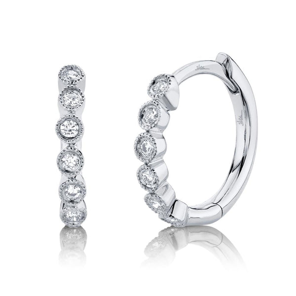 Radiating timeless charm, these 1/10ctw Diamond 14k White Gold Huggie Earrings exude effortless sophistication. Each earring features a graceful row of round brilliant-cut diamonds, bezel-set in luminous 14k white gold to enhance their captivating sparkle. The huggie design offers a sleek, comfortable fit while maintaining a refined elegance suitable for any occasion. Delicate yet dazzling, these earrings are the perfect finishing touch for both everyday wear and elevated ensembles.