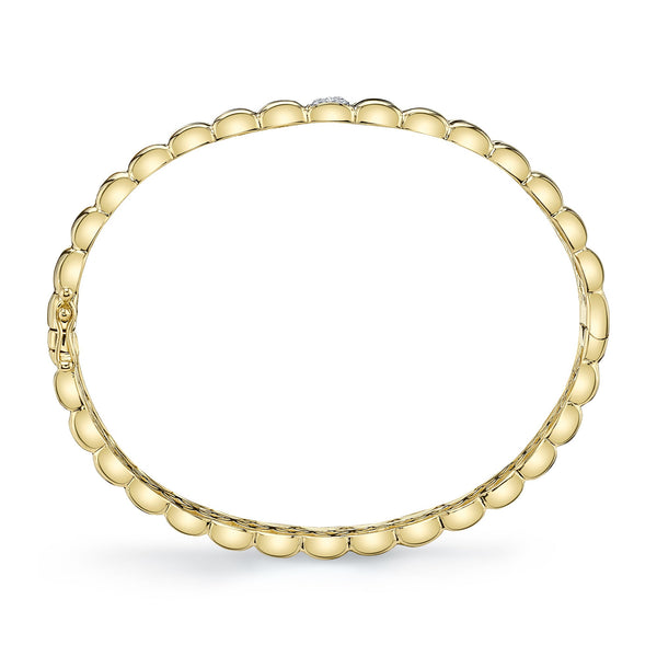 Crafted in glowing 14k yellow gold, this refined bangle features 1/6ctw of sparkling diamonds delicately set at the center for a touch of graceful brilliance. The smooth, high-polish links create a radiant stream of gold, while the diamond accent adds just the right amount of light-catching allure. Elegant and understated, it transitions effortlessly from everyday sophistication to evening shine. A timeless piece on its own or layered with other favorites, this bangle brings effortless luxury to any ensemble.