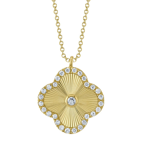 Radiating elegance and charm, this enchanting clover necklace is crafted in luxurious 14k yellow gold and adorned with 1/5ctw of sparkling diamonds. A bezel-set center diamond is framed by a halo of brilliant stones, each one enhancing the ribbed, sunburst-inspired texture of the pendant. Designed for effortless versatility, it can be worn at 15, 16, 17, or 18 inches, making it perfect for layering or standalone sparkle. Finished with a secure lobster clasp, this luminous piece is a timeless symbol of grace and good fortune.