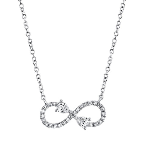 Timeless and symbolic, this pear infinity necklace sparkles with diamonds totaling 1/5ctw, celebrating endless love and elegant style. Crafted in luminous 14k white gold, its graceful infinity silhouette is accented by two pear-shaped diamonds, adding a touch of romantic brilliance. Designed for versatility, it can be worn at 15, 16, 17, or 18 inches to complement any neckline. Finished with a secure lobster clasp, this necklace offers a refined sparkle perfect for every occasion.