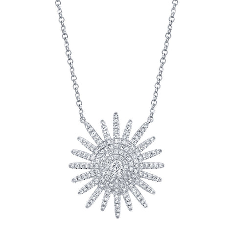 Radiating brilliance from every angle, this 3/8ctw diamond starburst necklace dazzles in luminous 14k white gold. The pendant’s intricate design features concentric rows of sparkling round diamonds, forming a radiant burst reminiscent of a sunbeam captured in light. Each diamond is meticulously set to enhance its fire and brilliance, creating a breathtaking shimmer with every movement. Elegant and luminous, this piece is a timeless celebration of glamour and grace.