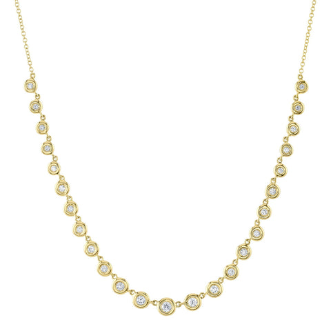 Radiating timeless elegance, this 5/8ctw Diamond 14k Yellow Gold Bezel Necklace captures the essence of refined luxury. Each round brilliant diamond is delicately set in a polished bezel of luminous 14k yellow gold, creating a seamless flow of sparkle and sophistication. The graduated design gracefully accentuates the neckline, offering a look that’s both modern and eternally chic. Perfect for elevating everyday elegance or enhancing a formal ensemble, this necklace is a stunning celebration of light and craftsmanship.