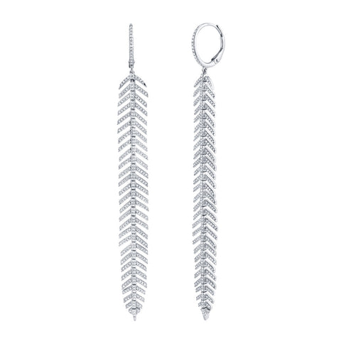 Ethereal and captivating, these 1 3/8ctw diamond feather earrings glisten with graceful movement and radiant sparkle in 14k white gold. Each earring cascades in a delicate feather motif, intricately set with shimmering round diamonds that catch the light with every turn. The elongated silhouette evokes elegance and fluidity, reminiscent of a feather drifting on a breeze. A masterpiece of refined luxury, these earrings make a dazzling statement of sophistication and style.
