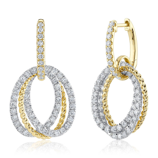 Radiating opulence and grace, these 14k two-tone gold oval earrings shimmer with 2 1/3ctw of round brilliant diamonds. Interlocking ovals of polished yellow gold and diamond-encrusted white gold create a dazzling interplay of light and texture. The rope-textured gold adds a touch of sophistication, while the sparkling diamonds bring timeless allure. Perfect for evening elegance or everyday glamour, these earrings are a breathtaking expression of modern luxury.