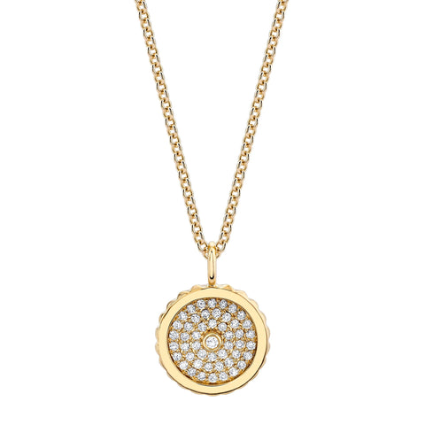 Modern and undaunted, our Tetra Pavé Bezel Medallion features 0.40cts of sparkling round pavé set diamonds surrounding a single bezel set diamond, all offset by miniature pyramid studs. Tell your story with a pendant that shines and sparkles.