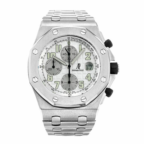 The Audemars Piguet Royal Oak Offshore (ref. 25721TI.OO.1000TI.05) features an automatic movement; white with luminescent markers arabic numerals, luminescent hands dial; sapphire-crystal, transparent case back; and 42 mm, titanium case on a titanium strap with a titanium folding clasp.