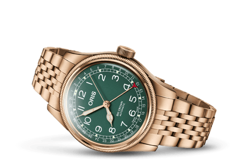 The Big Crown Pointer Date, an Oris icon since 1938, now comes in full bronze with a standout green dial. This timeless design includes a solid bronze case, bezel, and crown, along with an oversized crown and red crescent-tipped pointer date hand. A signature piece in Swiss watchmaking.