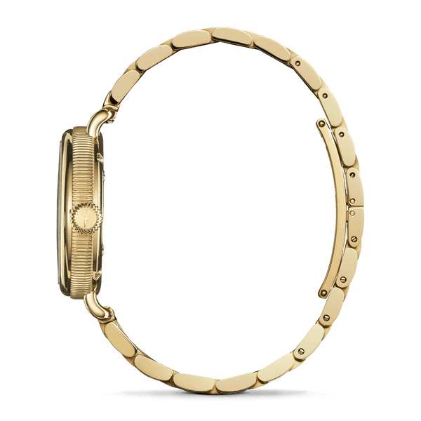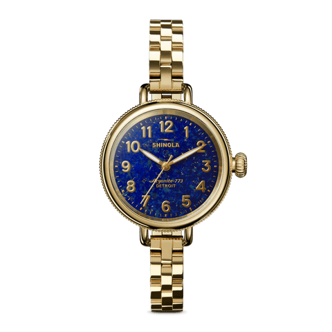 This fun and sophisticated Shinola classic features all the iconic Birdy details—playful proportions, a coin edge and wire lugs—but soars to new heights with a gorgeous lapis lazuli gemstone dial. Because every lapis stone is formed differently over millennia, each timepiece is one-of-one in its deep blue shade and detailing. The warm gold stainless steel case and bracelet complete the look of this iconic Detroit-assembled watch.