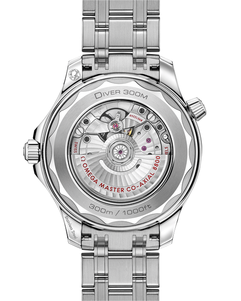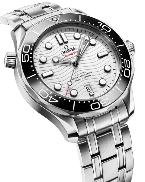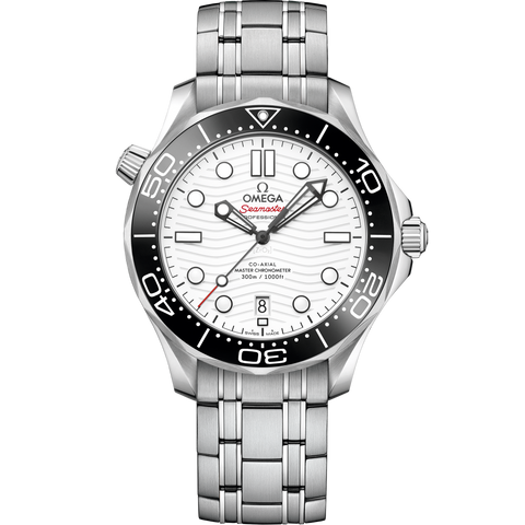 Since 1993, the Seamaster Professional Diver 300M has enjoyed a legendary following. Today’s modern collection has embraced that famous ocean heritage and updated it with OMEGA’s best innovation and design.This 42 mm model is crafted from stainless steel and includes a black ceramic bezel with a white enamel diving scale. The dial is polished white ceramic and features laser-engraved waves and Seamaster highlighted in red.The polished, blackened skeleton hour and minute hands are filled with white Super-LumiNova. The seconds hand features a varnished red tip.The watch is presented on a polished-brushed stainless steel bracelet and is driven by the OMEGA Master Chronometer Calibre 8800, which can be seen through the sapphire-crystal on the wave-edged caseback.