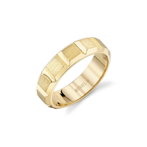 Bold and structured, the MICHAEL M men's block band features refined beveled edges that mimic architectural design, creating a powerful yet masculine style. Finished with a sleek brushed surface, the interior reveals the iconic MICHAEL M signature.