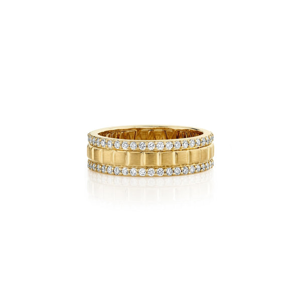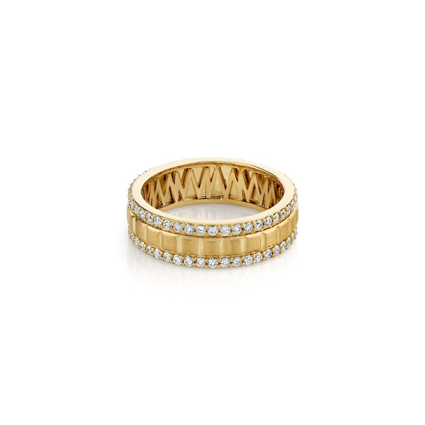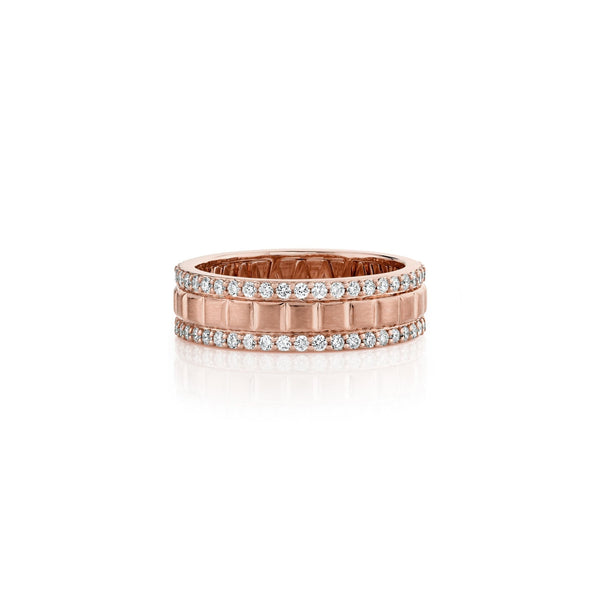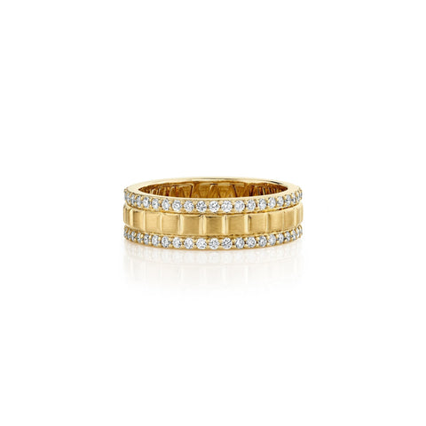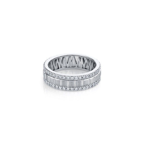 This Men's Block Pave Band features a sophisticated three-row design, combining a sparkling pave setting with a distinctive center row showcasing the men's block motif. Crafted to balance bold style with refined detail, this band offers a contemporary yet timeless look. Its intricate pave work enhances the ring’s brilliance, while the block motif adds a masculine edge, making it an ideal choice for those seeking a statement piece that complements both casual and formal attire. Durable and expertly finished, this band is designed for lasting wear and enduring appeal.