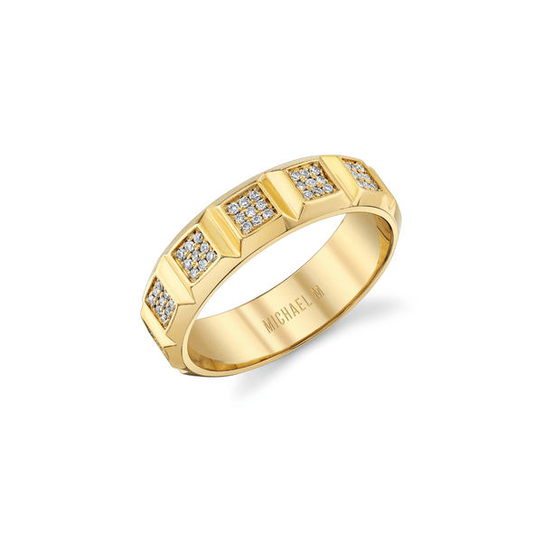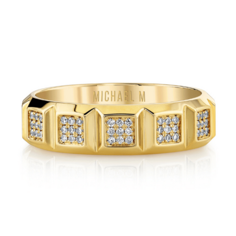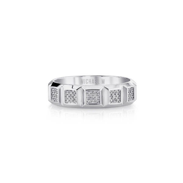 Bold and structured, the MICHAEL M men's block band features refined beveled edges that mimic architectural design, blending power and masculinity. The sleek brushed surface is elevated with pavé diamonds for added brilliance, while the interior showcases the iconic MICHAEL M signature.