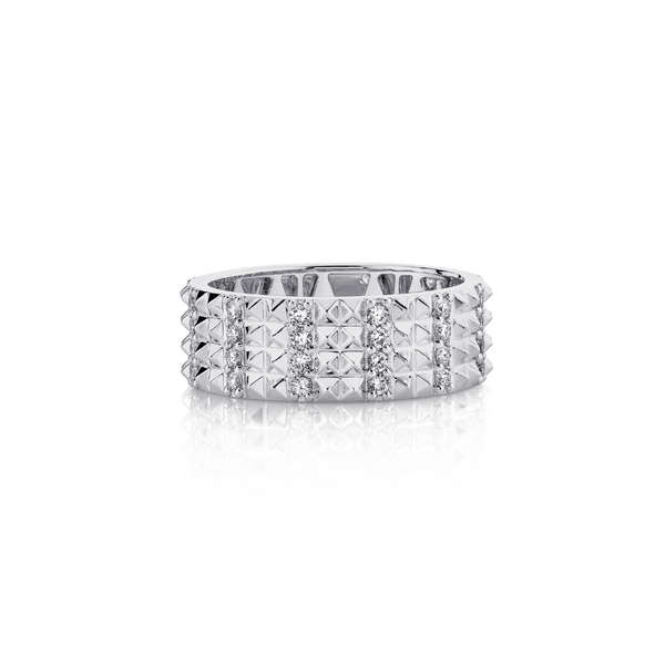 The structure for the Men's Tetra Diamond Band ring is created with four rows of alternating diamonds and pyramid studs. The interior of the band holds the uniquely branded Michael M gallery.