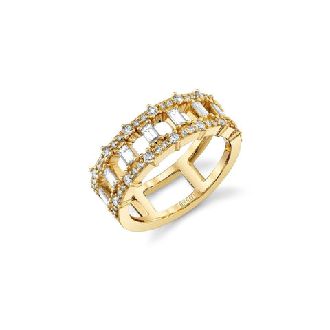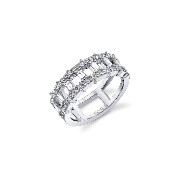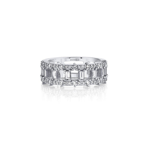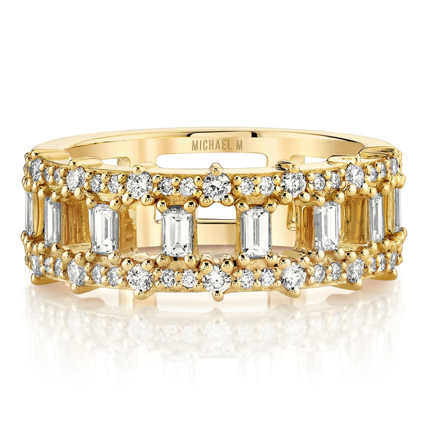 The Montage Baguette Band features vertical baguette-cut diamonds placed between two pavé bands. The diamonds are arranged in an alternating pattern with open cutout spaces, resulting in a unique design that enhances the brilliance of each diamond.