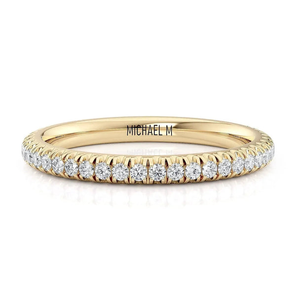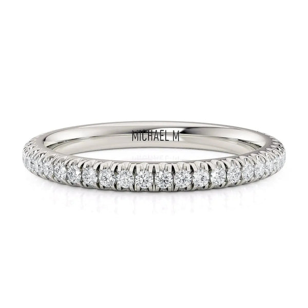 This MICHAEL M wedding band is adorned with diamonds handpicked by a certified MICHAEL M gemologist, each side stone has a minimum average color of G, a minimum average clarity of VS, and are hand-placed in an elegant prong setting by one of MICHAEL M’s master artisans.