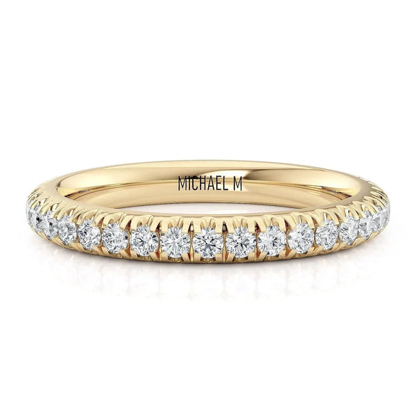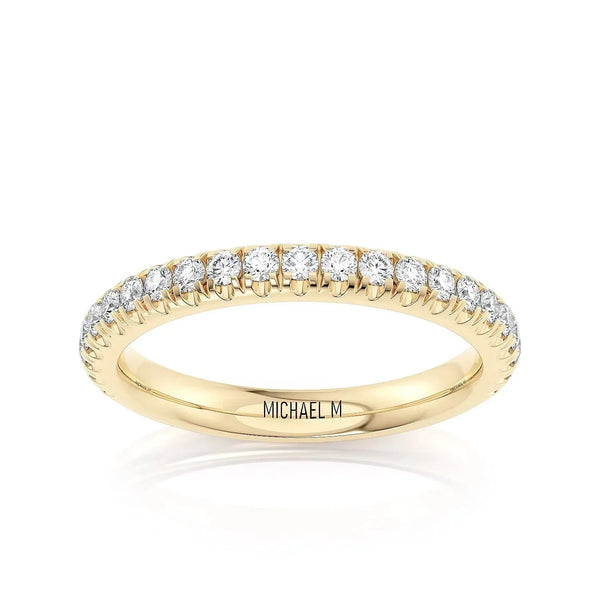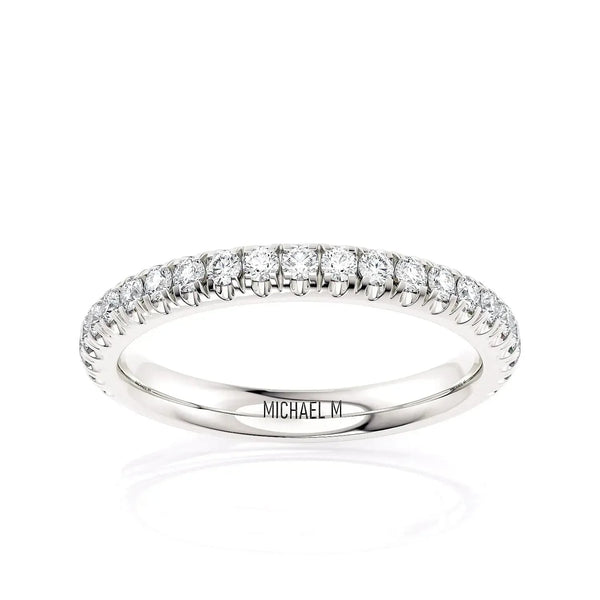 This MICHAEL M wedding band is adorned with diamonds handpicked by a certified MICHAEL M gemologist, each side stone has a minimum average color of G, a minimum average clarity of VS, and are hand-placed in an elegant prong setting by one of MICHAEL M’s master artisans.