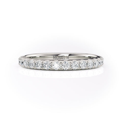 This MICHAEL M wedding band is adorned with diamonds handpicked by a certified MICHAEL M gemologist, each side stone has a minimum average color of G, a minimum average clarity of VS, and are hand-placed in an elegant prong setting by one of MICHAEL M’s master artisans.