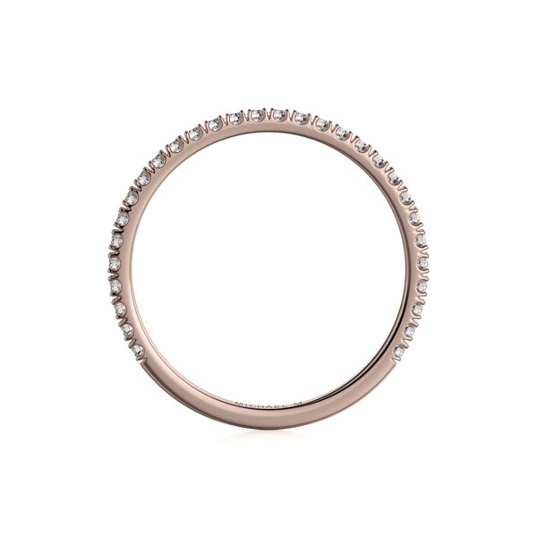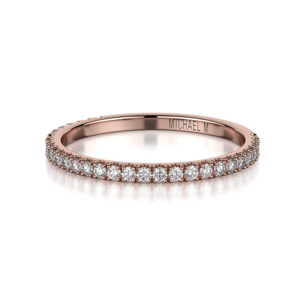 This MICHAEL M wedding band is adorned with diamonds handpicked by a certified MICHAEL M gemologist, each side stone has a minimum average color of G, a minimum average clarity of VS, and are hand-placed in an elegant prong setting by one of MICHAEL M’s master artisans.