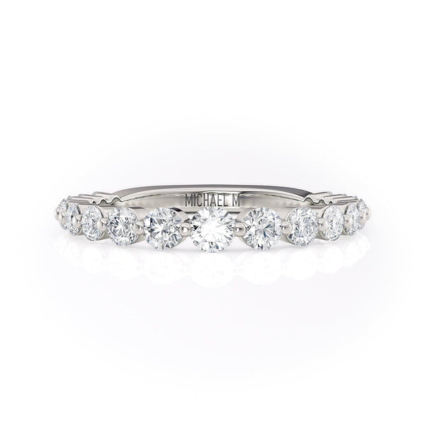 This MICHAEL M wedding band is adorned with diamonds handpicked by a certified MICHAEL M gemologist, each side stone has a minimum average color of G, a minimum average clarity of VS, and are hand-placed in an elegant prong setting by one of MICHAEL M’s master artisans.