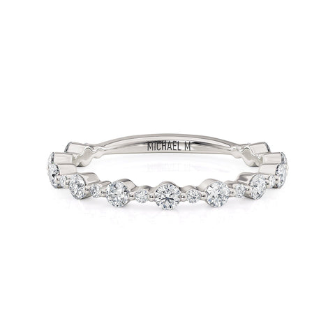 The R803B is expertly designed by MICHAEL M and features alternating smaller and larger round diamonds. Crafted with high-grade materials and meticulous skill, this wedding band guarantees a lasting quality that will withstand the test of time.