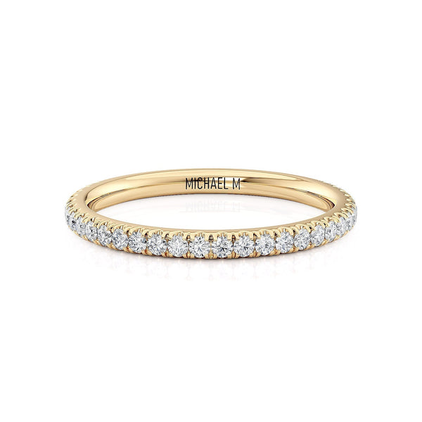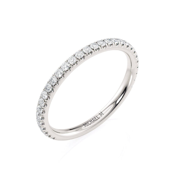 This MICHAEL M wedding band is adorned with diamonds handpicked by a certified MICHAEL M gemologist, each side stone has a minimum average color of G, a minimum average clarity of VS, and are hand-placed in an elegant prong setting by one of MICHAEL M’s master artisans.