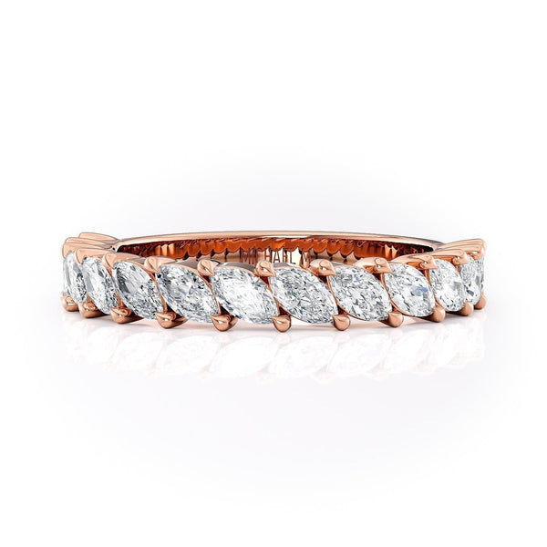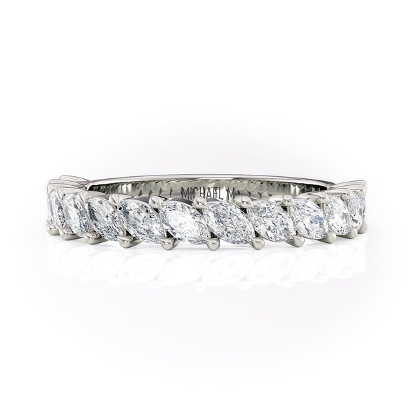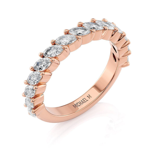 This wedding band by MICHAEL M presents a modern interpretation of a classic style, showcasing marquise-cut diamonds positioned in a distinctive pattern for a flawless blend of traditional and contemporary elegance.