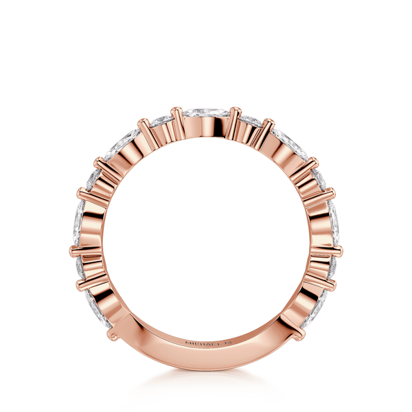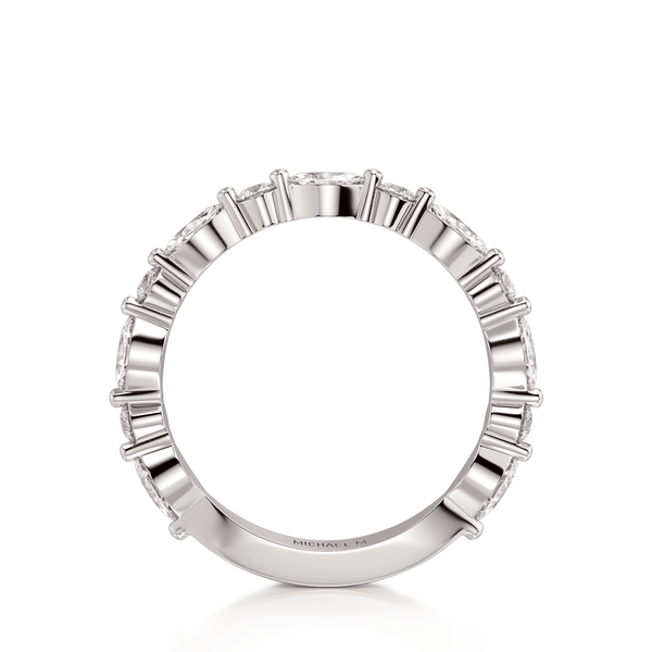 The R831B wedding band features a modern and timeless design with alternating marquise and round diamonds. Each diamond has a shared prong setting to enhance sparkle and durability. This carefully crafted band offers a refined and elegant look, ideal for those seeking a unique yet classic symbol of commitment.