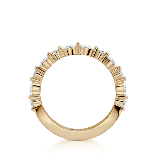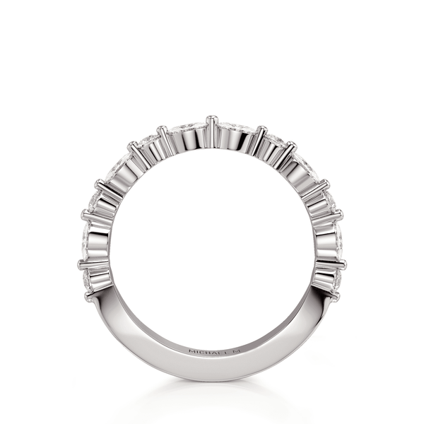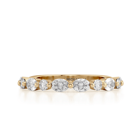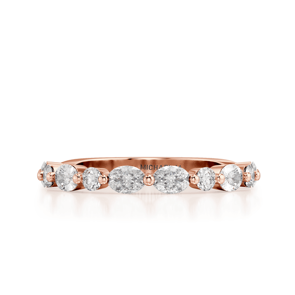 The R837B wedding band features a harmonious mix of alternating oval and round diamonds. Each stone is delicately spaced to highlight its individual brilliance while creating a continuous ribbon of sparkle across the finger.