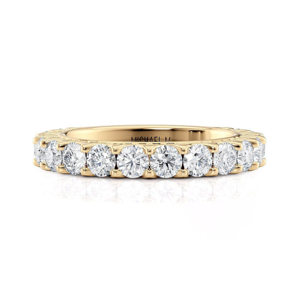 This MICHAEL M wedding band is adorned with diamonds handpicked by a certified MICHAEL M gemologist, each side stone has a minimum average color of G, a minimum average clarity of VS, and are hand-placed in an elegant prong setting by one of MICHAEL M’s master artisans.