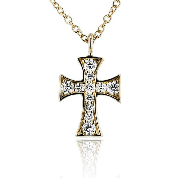 This pendant features a striking gothic cross design elevated by precisely set diamonds that create a stunning encrusted effect, enhancing the cross's architectural details.