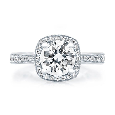 From the Seasons of Love Collection, this A.JAFFE round diamond engagement ring features an ornate basket below a cushion shaped halo, tapered diamond shank, and a quilted interior.