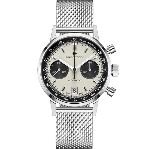 A modern take on a 1968 signature piece, the Intra-Matic Auto Chrono with its sporty but classic design and distinctive panda dial is sure to catch the eye. The vintage-inspired favorite is paired with a finely engineered stainless steel mesh bracelet for the ultimate in comfort and style.