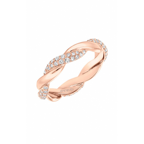 Contemporary pave diamond and gold twisted band. Can be worn as stackable ring, wedding or anniversary band. Available in white, yellow and rose gold.