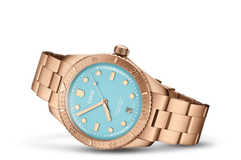 A FRESH PALETTE The Divers Sixty-Five ‘Cotton Candy’ is a beacon of joy. It has an all-bronze case, bezel, crown, and bracelet with vibrant dial colours. The 38mm case is unisex, powered by a Swiss Made mechanical movement. These watches symbolize optimism and better times.