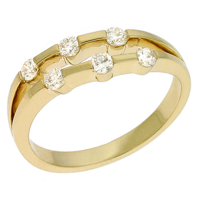 This fashion diamond ring is available in 14K Yellow Gold. There are a total of 6 stones. There are round diamonds with a total carat weight of 0.34ct