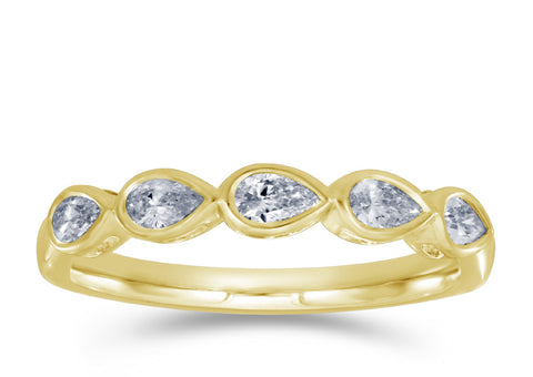 This fashion diamond ring is available in 14K Yellow Gold. There are a total of 5 stones. There are pear shape diamonds with a total carat weight of 0.50ct set in a Bezel Set setting