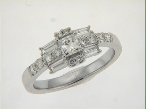 This fashion diamond ring is available in 14K White Gold. There are a total of 17 stones. There are princess diamonds with a total carat weight of 0.38ct there are round diamonds with a total carat weight of 0.30ct. there are tapered baguettes diamonds with a total carat weight of 0.23ct.