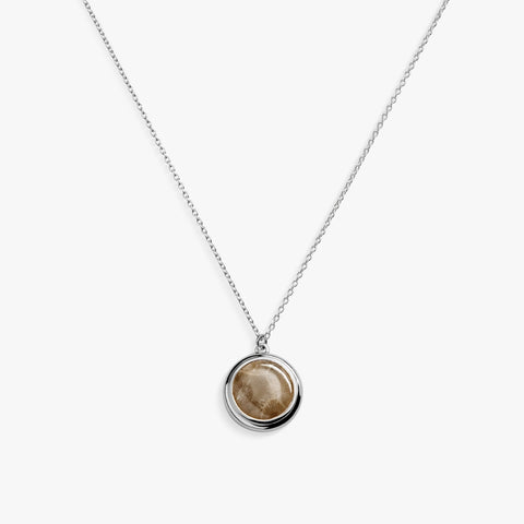 An heirloom-worthy collection designed for personalization. This simple pendant necklace features a bezel-set domed Petoskey stone centerpiece. It is strung on a delicate sterling silver cable chain that is adjustable from 20” to 22”. The back of the charm features a blank surface that takes cues from our iconic watch caseback, perfect for engraving.