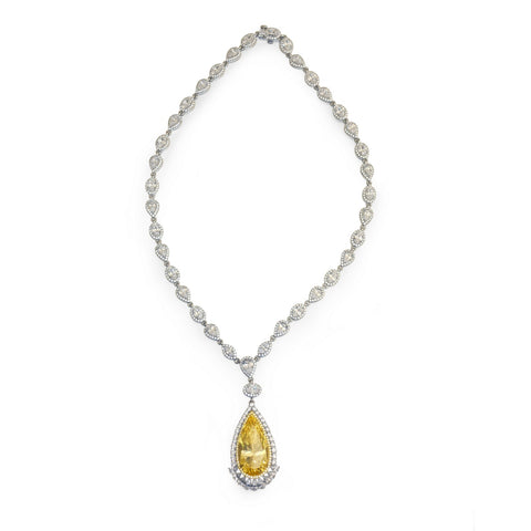A stunning regal statement. This ravishing statement necklace features a breathtaking pendant set with a Lafonn canary simulated diamond center stone, surrounded by Lafonn's signature clear simulated diamonds. The pendant is suspended from a necklace set with Lafonn's clear pear-shaped and round simulated diamonds. This necklace is mounted in sterling silver bonded with platinum.